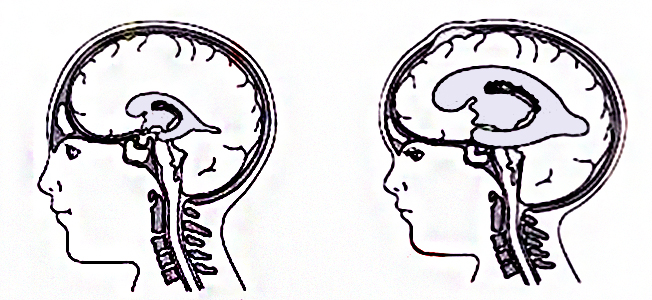 多在出生后数周头颅开始增大,一般经过3~5个月才逐渐发现,也有出生时头颅即增大者。临床特别是因颅内压增高引起头颅进行性的异常增大,与周身发育不成比例。额部向前突出、眶顶受压向下,双眼球下视,眼球向下转,致巩膜上部露白,前囟扩大且张力增加,其他囟门也可扩大,颅骨骨缝分离,头皮静脉扩张。头颅叩诊呈“破壶音”。